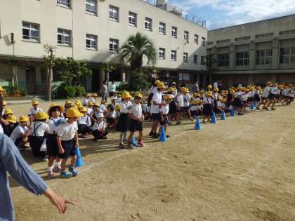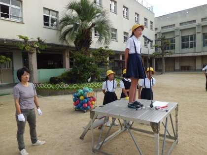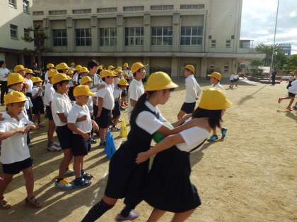 10月8日(木)の集会活動は縦割り班で「おんぶで抱っこ」という名前の二人一組になってボールを運ぶゲームを行いました。集会委員会の児童の説明の後、各グループ6組で競争しました。ボールをはさみながら、二人の息を合わせて走るのは結構難しいようです。でも、楽しい時間を過ごしました。