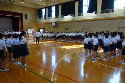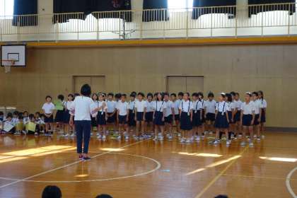 4年生の素晴らしい模範歌唱のあと、みんなで練習して、合唱しました。