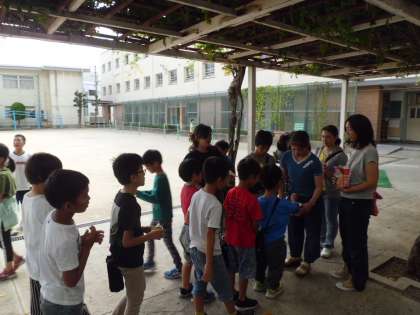 おやつのアイスキャンディーを食べて、さあ、夜に向けて、テントの設営です。今晩は、台風の影響で雨が降るかもしれないので、講堂にテントを張りました。班のみんなであーでもないこーでもないと考え、協力してやっと完成です!