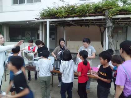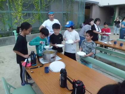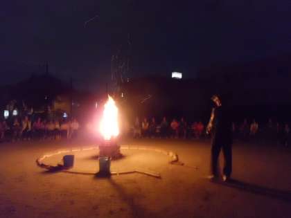 カレーの後は、近くの銭湯に行き、その後キャンプファイヤーです。地域の方がファイヤーマスターを務めてくださりその方のお知り合いもゲストで登場。青少年指導員の方々も盛り上げてくださいました。