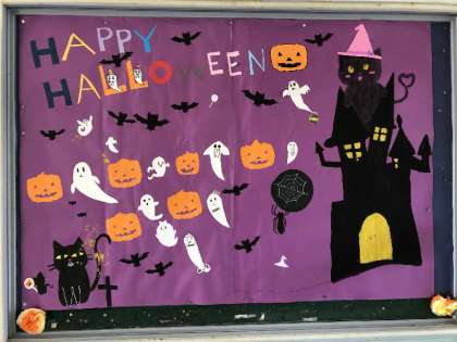 玄関の掲示もかわりました。とてもかわいいハロウィンのデザインになっています。