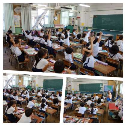 10日、2時間目、一年生は算数の時間。 先生の質問にみんな元気よく手を挙げていました。