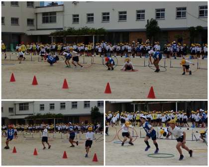 ハードルを低学年はくぐって、高学年は跳ぶか、くぐるかして、フラフープもくぐって、コーンでターンして、次の人にリレーしていきます。