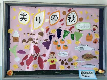 玄関入ってすぐ右手の掲示板には、給食委員会が作ったものが掲示されています。