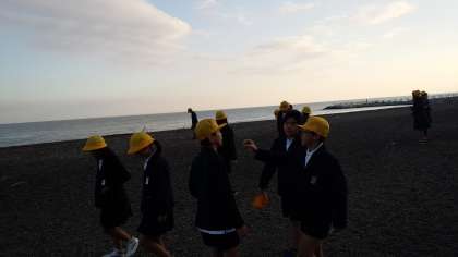 おはようございます。修学旅行2日目になりました。夜はぐっすり眠れたのでしょうか?ちょっと眠そうですが、全員元気です。夫婦岩まで散歩です。今日もいい天気で、朝の景色は最高です。