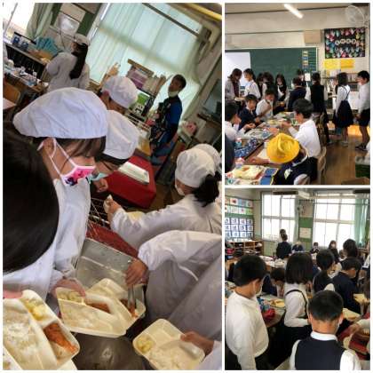 低学年、中学年、高学年同士で半数ほどがそれぞれお互いの教室に行って、一緒に給食を食べました。