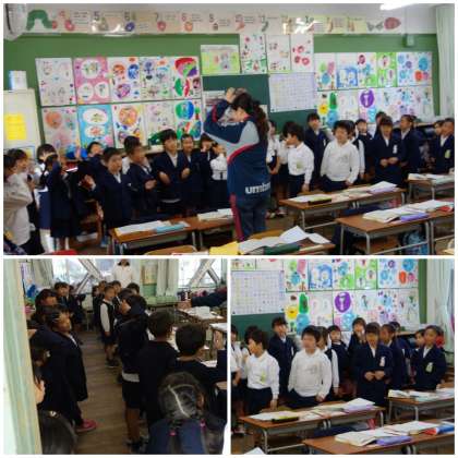 学習発表会の練習でしょうか。みんな後ろに下がって、並んでいました。