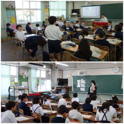 3年1組は国語(写真上)、2組は栄養教育(写真下)。