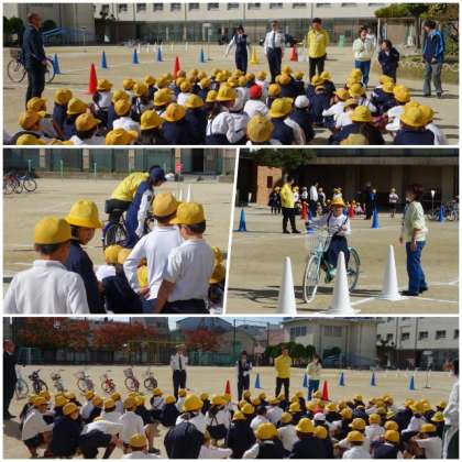 15日、3時間目は中学年の交通安全教室です。3,4年生では一部の人に自転車を持ってきてもらうようにお願いしました。