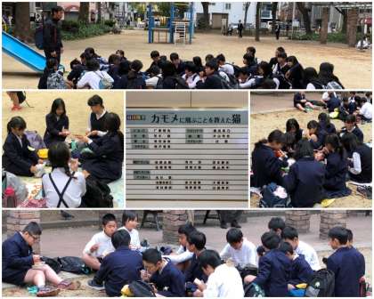 とてもたくさんの小学生が劇場の前の公園に集まり、これだけの人数が入るのかと思うほどでした。