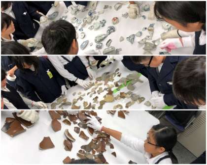 考古学体験、3つ目は、出土した焼き物の破片をつなぎ合わせて、復元するミッション。