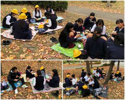 ここで歴史博物館を後にして、ピースおおさかに向かいました。ピースおおさかの前の落ち葉が敷き詰められた林の中で昼食を食べました。