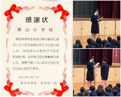 ・22日水曜日に持ってきてもらった書き損じはがき等について、桃谷中学校生徒会のお姉さんが報告と感謝状の贈呈に来てくれました。