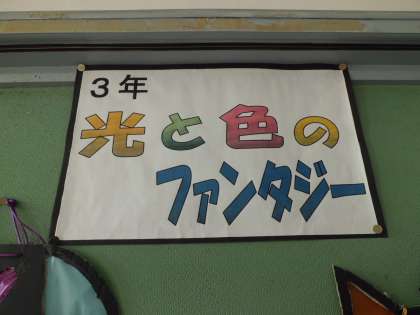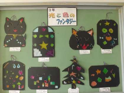 玄関の掲示物は現在、3年生の作品を掲示しています。「光と色のファンタジー」です。学校に来られた時にご覧ください。