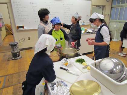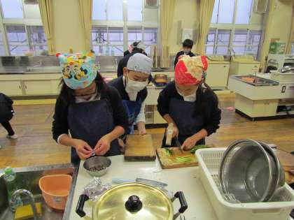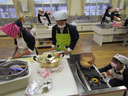 12月4日(木)5年2組で家庭科の調理実習を行いました。今回は「ご飯と味噌汁」です。ご飯は炊飯器ではなく、鍋でたきました。少しこげができたところもありましたが、ふっくらとたきあがりました。味噌汁は煮干しでだしをとり、うすあげとねぎを入れて作りました。できあがりに笑みもこぼれます。