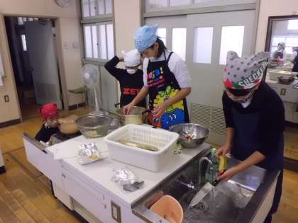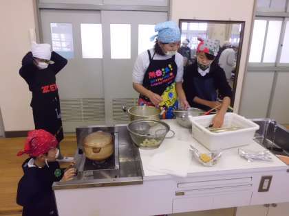 12月5日(金)、今日は5年1組の調理実習がありました。ご飯とみそ汁です。今日は私(校長)も試食をさせてもらいました。直に火があたっているところは、ご飯が少し硬めですが、全体的にふっくらと炊きあがっていました。みそ汁はだしの味がきいていておいしかったです。どの子どももグループで協力しながら、熱心に実習に取り組んでいました。
