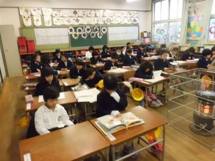 毎週水曜日、始業前の時間を利用して、「漢字・計算タイム」を行っています。写真は、1年の様子です。国語・算数を中心に、プリントやドリルを使って学習を進めていきます。また、早く終わった児童は、読書や自分の課題に自主的に取り組みます。どの学年もしっかりと学習できていました。