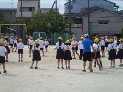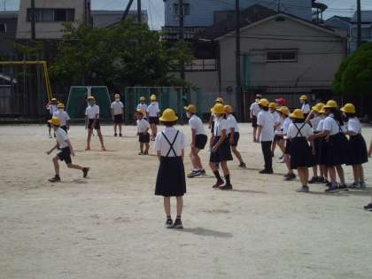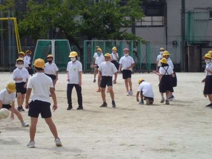 休み時間に学級全員で運動場に出て、ドッジボールをする5年生です。