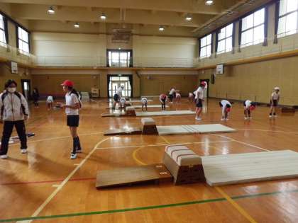 体育館で跳び箱運動をしている様子です。小学校時期にいろいろな運動経験をすることが大切です。
