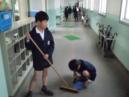 冷たい雨が降っています。明日は回復に向かうようです。子どもたちの昼の掃除の様子です。教室や廊下など協力して学校を美しくしています。