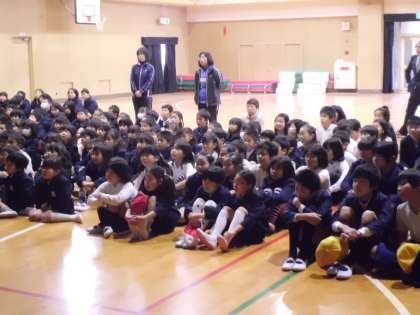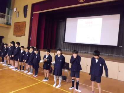 毎週木曜日は児童集会になっていますが、今日は給食委員会からの給食についての発表がありました。給食が始まったわけ、給食を食べるまでに気をつけなければいけないこと、残さず食べるなど、映像を見ながらの発表です。子どもたちは静かにまた、真剣に聞き入っていました。