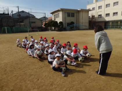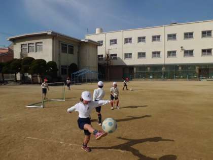2月16日(月)2時限目、1年が体育科の学習で「ボールけりゲーム」を行いました。ボールの扱いに慣れる運動をした後、4つの班に分かれて、ゴールをねらってボールを蹴ります。ゴールやボールの位置を確かめて、しっかりとボールを蹴ることができていました。