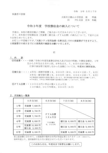 ・令和3年度 学校徴収金の納入について