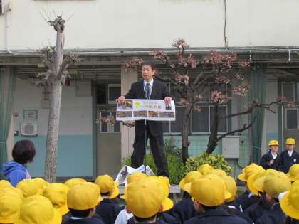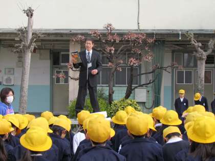 3月16日(月)の児童朝会で70年前の3月13日にあった大阪大空襲の話をしました。2月末に本校の卒業生の方が来校されました。77年前は浪速区におられ、1年生の時に空襲にあわれました。その体験を手書きの絵や文章でまとめられ、本を出されました。新聞やテレビでも紹介されました。来校された時にいただいた資料を使っての話です。これからも平和な世の中が続くことを願います。
