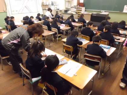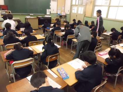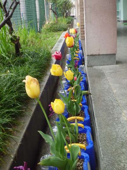 1年生教室前のチューリップがきれいな花をつけています。今日は各学級の授業の様子を見て回りました。算数や国語、発育測定など各教室で熱心に授業が進められていました。