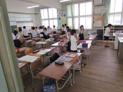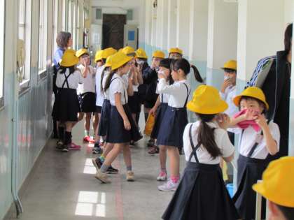 雨が心配されましたが、本年度、最初の避難訓練を行いました。今回は管理作業員室から出火、燃え移る恐れがあるということで運動場に避難しました。静かに早く集合することができました。