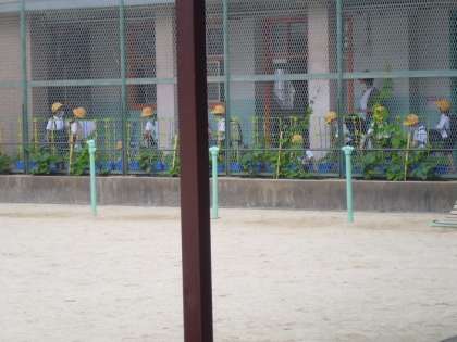 下校前には、必ずみんなで水やりをするのが習慣になりました。 アサガオは、どんどん成長しています。