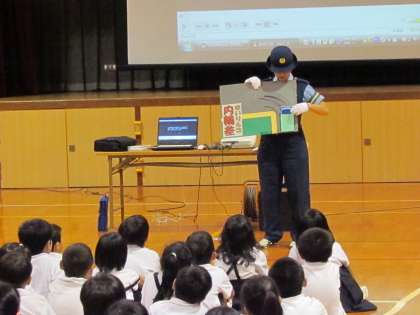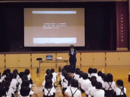 9月10日生野警察よりお二人の警察官の方にお越しいただいて、交通委安全教室を実施しました。信号機の見方や交差点を横断するときの注意点や車の内輪差など、図をもとに詳しく教えていただきました。また、ビデオを楽しみながら、正しい歩行や自転車を乗る時の注意などを学習しました。