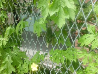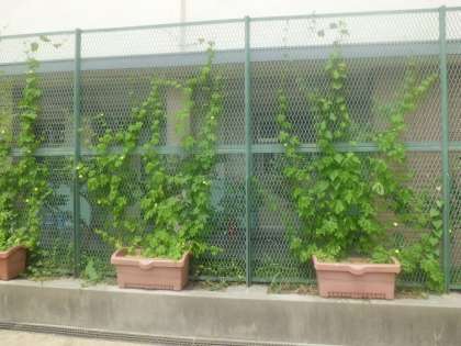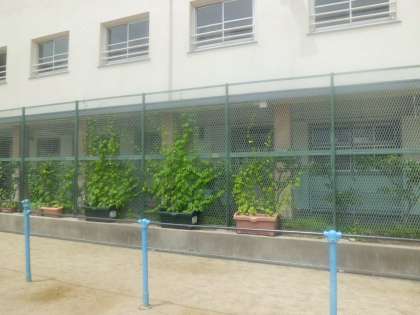 昨年度は西校舎の耐震補強工事のため、緑のカーテンをすることができませんでした。今年はゴーヤを植え、つるが大きく伸びてきました。小さいゴーヤ(にがうり)ができています。