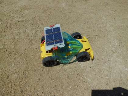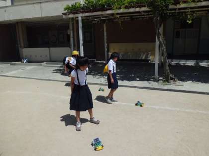 7月15日(水)3時限目に4年生が理科の学習で作ったソーラー電池の車を運動場で走らせました。日差しがきついので、土の上でも結構走りました。路面が平らな方がよく走ります。