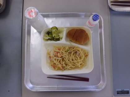 平成27年度1学期最後の給食です。メニューはシーフードトマトスパゲッティ、グリーンサラダ、発酵乳、黒糖パン、牛乳です。校長や教頭は子どもたちが食べる時刻よりも30分以上前に検食といって先に食べます。カレーライスとともにスパゲッティは子どもの好きなメニューの一つです。