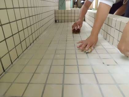 シャツをまくり上げて、一生懸命、流しを磨く子どもがいる一方、