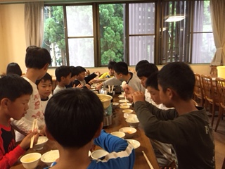 夕食と室内ゲームの様子です。キャンプファイヤーは、雨で29日に順延になりました。