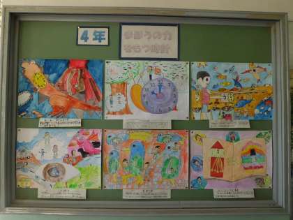 今、玄関を入って右の掲示板には4年生の作品が6枚掲示されています。「まほうの力をもつ時計」という図画作品です。