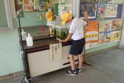 エントランスにメダカの水槽が置かれています。