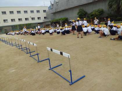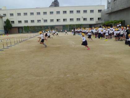 10月1日(木)朝の集会活動の時間に体育集会を実施しました。ハードルや体操用の輪などを使った縦割り班によるリレーです。障害物があるので、なかなか思ったようにうまく走ることができませんでしたが、楽しく行うことができました。