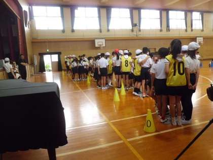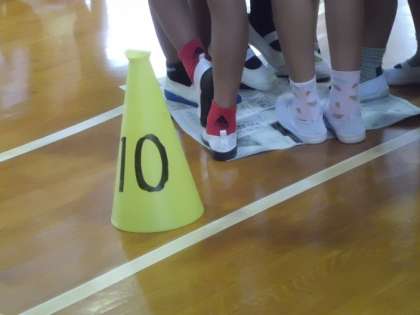 縦割り班で、新聞紙の上に何人乗れるかというゲームを行い、