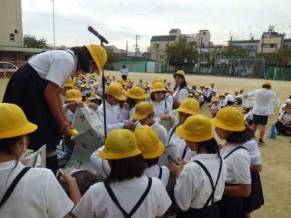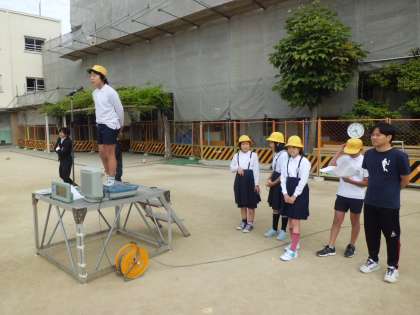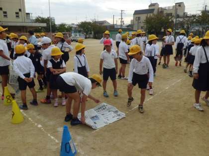 10月15日(木)の児童集会の様子です。今日は「新聞紙にのろう」です。小さな新聞紙の上に縦割り班のメンバー全員がのります。紙の面積が小さいのでうまくのることができませんが、頑張って挑戦していました。その後、児童会の皆さんが来週、月曜日から行われる、赤い羽根募金の案内をしました。