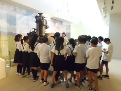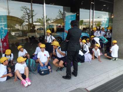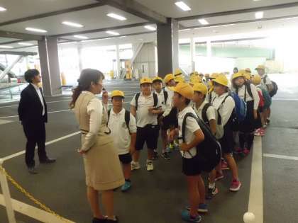 10月20日(火)、5年生が社会見学で、ダイハツ工業池田工場へ行きました。とても大きな工場で、甲子園球場の約3.5倍の面積があります。見学は、今まで生産されてきた車が展示されているスペースやいろいろな体験ができるスペースから始まりました。体験スペースでは、パソコンを使って車を設計することができました。工場見学では、実際に車を生産しているラインをまじかで見ることができました。多くの人の手を経て、車が生産されることがよくわかりました。