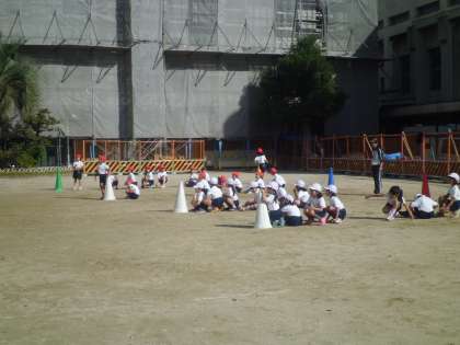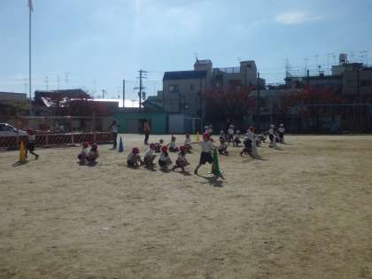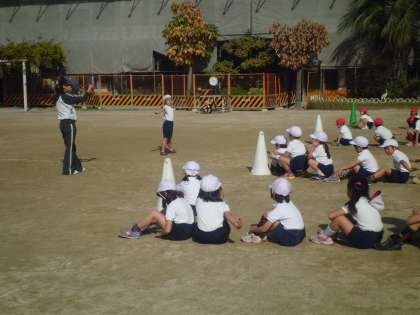 11月16日(月)2時限目、1年が体育科で「リレーでかけっこ」の学習をしました。4つのチームに分かれて、バトンパスをしながらのリレーです。バトンをうまくつなぐのにグループで頑張って運動をしていました。
