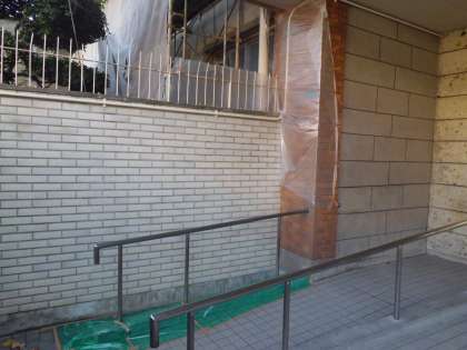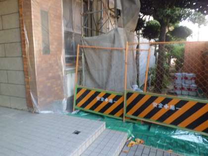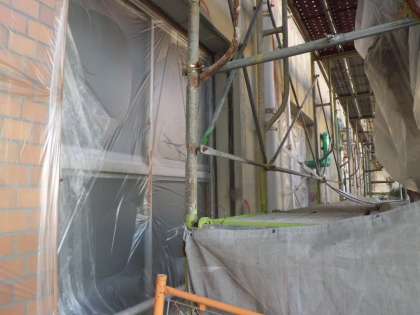 耐震補強工事が終盤にさしかかってきました。北側の壁面塗装が始まります。窓などに養生をして、ペンキがつかないようにしています。塗装が終わると、足場の撤去が始まります。