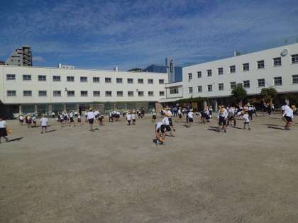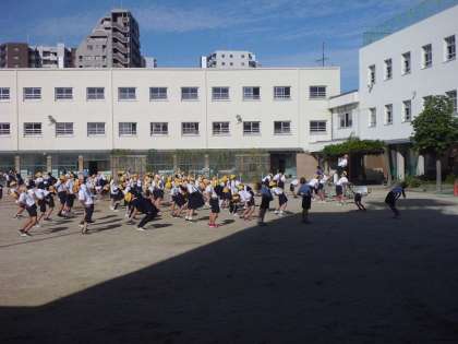 運動会を前に、ラジオ体操の練習と運動場の石拾いをしました。