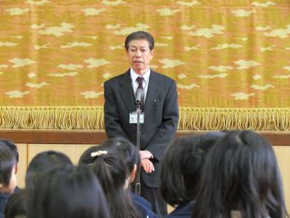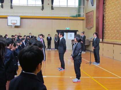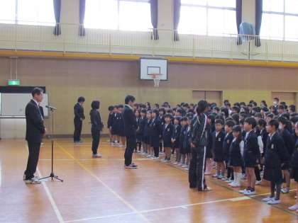 あけましておめでとうございます。平成28年の幕開けです。本年もどうぞよろしくお願いします。1月7日(木)3学期始業式を行いました。まず学校長(私)の話、その後、生活指導の話、最後に全員で校歌を歌いました。3学期はたいへん短い学期で6年生は2か月ほどで卒業をむかえます。子ども一人一人が自分の目標をもって、学校生活をおくってほしいと思います。