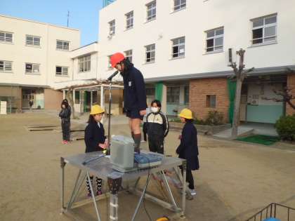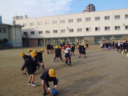 1月14日(木)たいへんいい天気になりました。授業が始まる前の時間、運動場で児童集会がありました。今日は二人一組、背中合わせでボールを運ぶゲームです。背中という見えにくい場所なので、なかなかうまくボールを運ぶことができません。工夫しながら頑張って、楽しくゲームをすることができました。