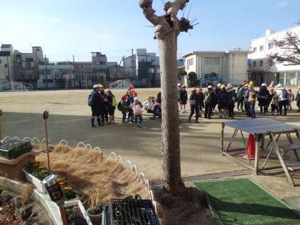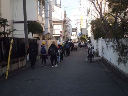 6年生が1年生の手をひいて、いろいろ優しく世話をしながらの