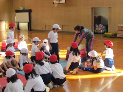 1月25日(月)2時限目、1年が体育館で体育科の「跳び箱あそび」をしました。今日は、パーとび(開脚跳び)の学習です。手をつく位置や踏み切る時の足の位置を確かめながら、何度も跳んでいました。